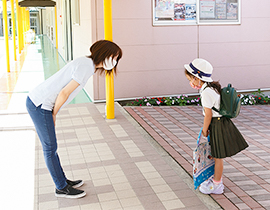 - 正門から入り、園長先生と朝の挨拶をして自分の保育室にいきます。
