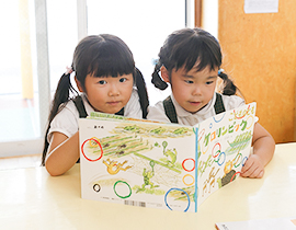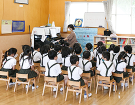 - 子どもたちがよく集中できる時間帯です。ピアノの曲に合わせて歌を 歌ったり、身体表現をしたり、リズム打ちをしたり、絵本や紙芝居を 読んでもらったりします。外遊びもします。
